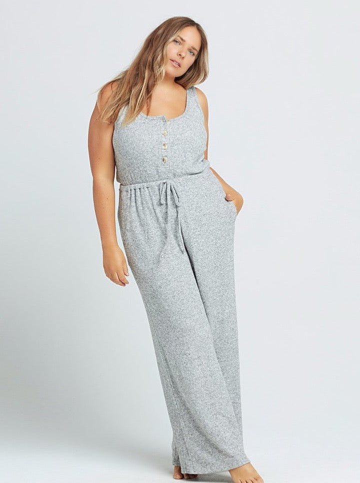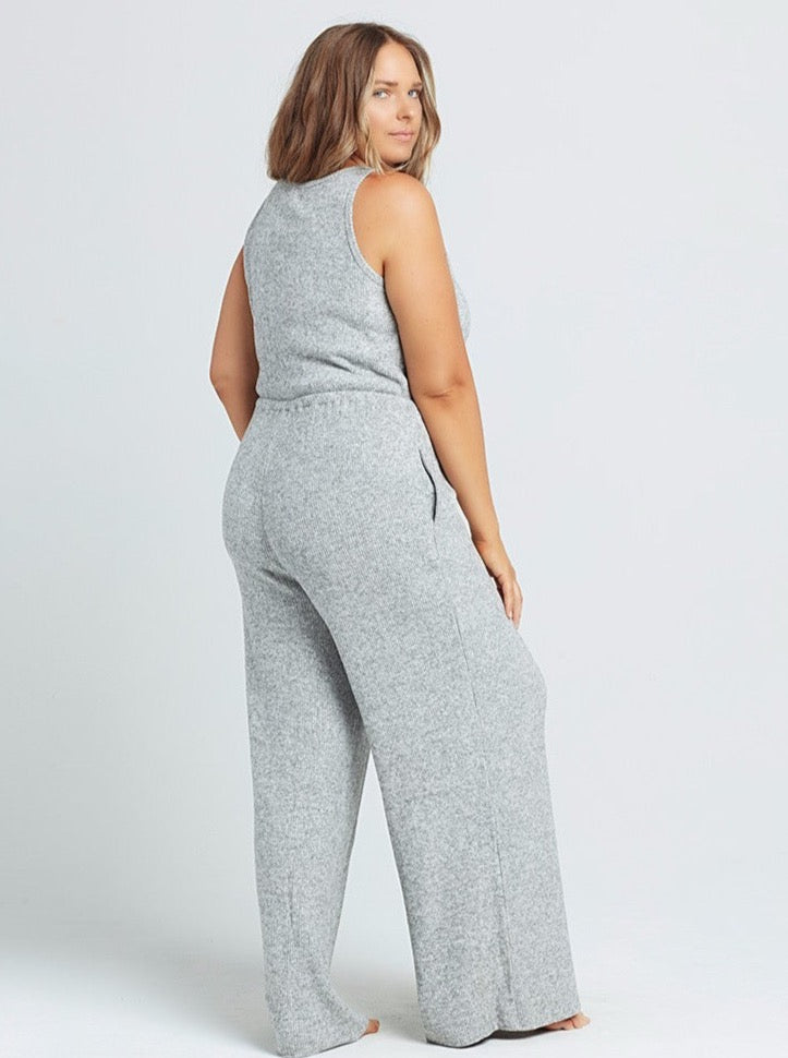 Lounge around in this soft ribbed jumpsuit, featuring a drawcord waist and wide legged pant.